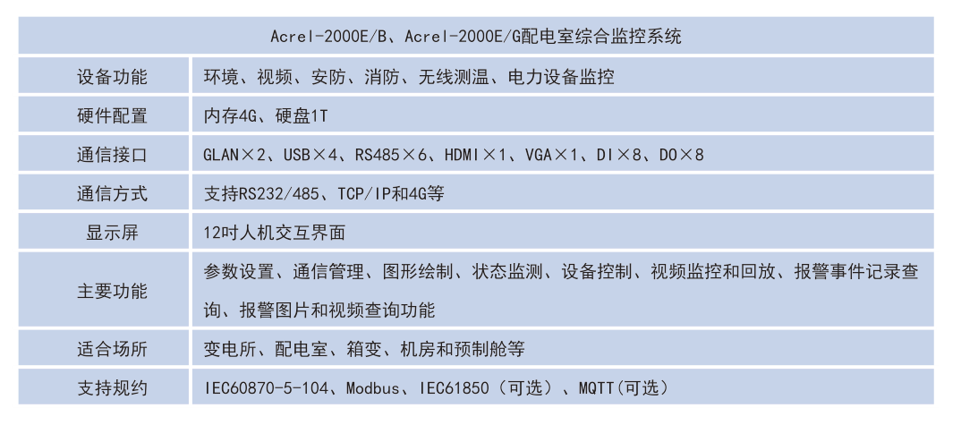 由于硬件資源以及系統(tǒng)軟件上的差別,Acrel-2000E/A作為針對變電所配電室的環(huán)境輔助監(jiān)控系統(tǒng),只對環(huán)境參量設(shè)備進(jìn)行在線監(jiān)測;而Acrel-2000E/B與Acrel-2000E/G作為硬件資源豐富,系統(tǒng)功能更為強(qiáng)大的設(shè)備,可以配合我司無線測溫以及電力儀表進(jìn)行在線監(jiān)測。