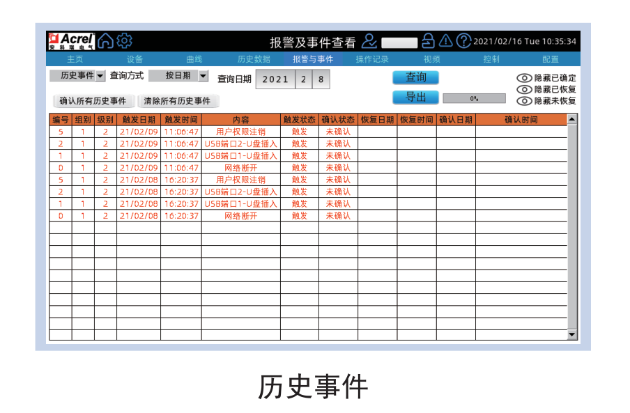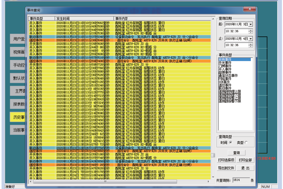 在“歷史事件”的界面,同“歷史數(shù)據(jù)”界面一樣,表格上方的查詢及導(dǎo)出按鈕分別提供相應(yīng)的查詢和導(dǎo)出功能,并且可以根據(jù)所選擇的不同查詢方式進(jìn)行不同方式的查詢功能。