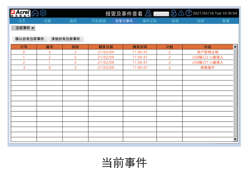 在“當(dāng)前事件”的界面,有事件類型下拉框、事件列表、確認(rèn)全部當(dāng)前事件以及清除全部當(dāng)前事件按鈕共4個部分,點(diǎn)擊確認(rèn)按鈕可以確定列表中所有還未確認(rèn)的事件,點(diǎn)擊清除按鈕可以清除列表中所有事件。
