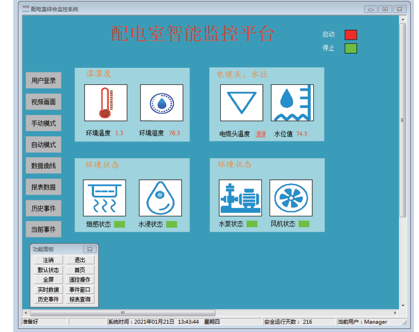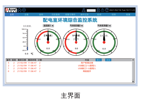 觸摸屏上電進(jìn)入工作狀態(tài)后,默認(rèn)為主界面,在此界面可觀察到配電室環(huán)境溫濕度、SF6氣體和O2濃度等監(jiān)測信息以及當(dāng)前事件列表。